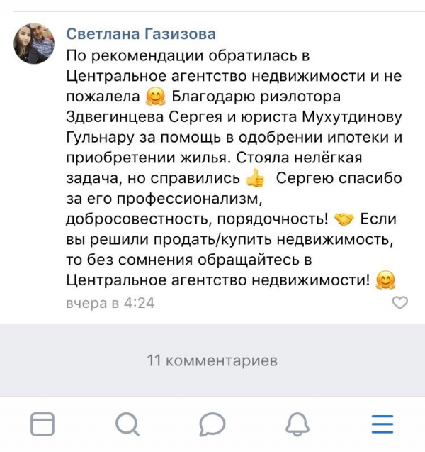 Продажа это фактор доверия Выражаем благодарность Центральному агентству недвижимости, а именно юристу Мухутдиновой Гульнаре Ахметгареевне @gulnara_ipoteka_rieltor и специалисту по недвижимости Ба...дгиевой Диане @dianabadgieva за помощь в продаже нашей квартиры. Работу выполнили быстро и честно. Диана вечером показала квартиру, а уже на следующее утро мы оформляли задаток. На всех этапах нас сопровождали, всё разъясняя. Желаю Вам дальнейшего плодотворного развития в работе и побольше благодарных клиентов. Спасибо!!!