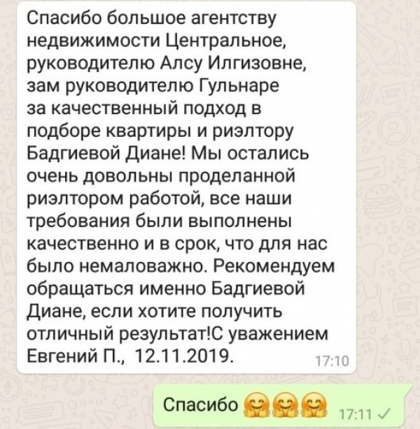 Спасибо большое агентству недвижимости Центральное, руководителю Алсу Ильгизовне, зам. руководителю Гульнаре за качественный подход в подборе квартиры и риэлтору Бадгиевой Диане! Мы остались очень дов...ольны проделанной риэлтором работой, все наши требования были выполненны качественно и в срок, что для нас было немаловажно. Рекомендуем обращаться именно к Бадгиевой Диане, если хотите получить отличный результат!